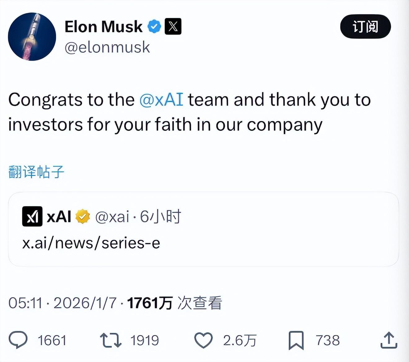 200亿美元的E轮融资,折合人民币就是1400亿元,而马斯克的这家AI初创企业,就是人们熟知的xAI,在拿下这1400亿元新融资后,世界首富马斯克也是在社交平台X上,对所有投资者表达了感谢。