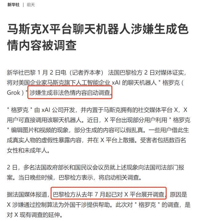 新华社也报道法国巴黎检方已经将其定义为“涉嫌非法”,且从去年7月就开始对社交平台X展开调查。