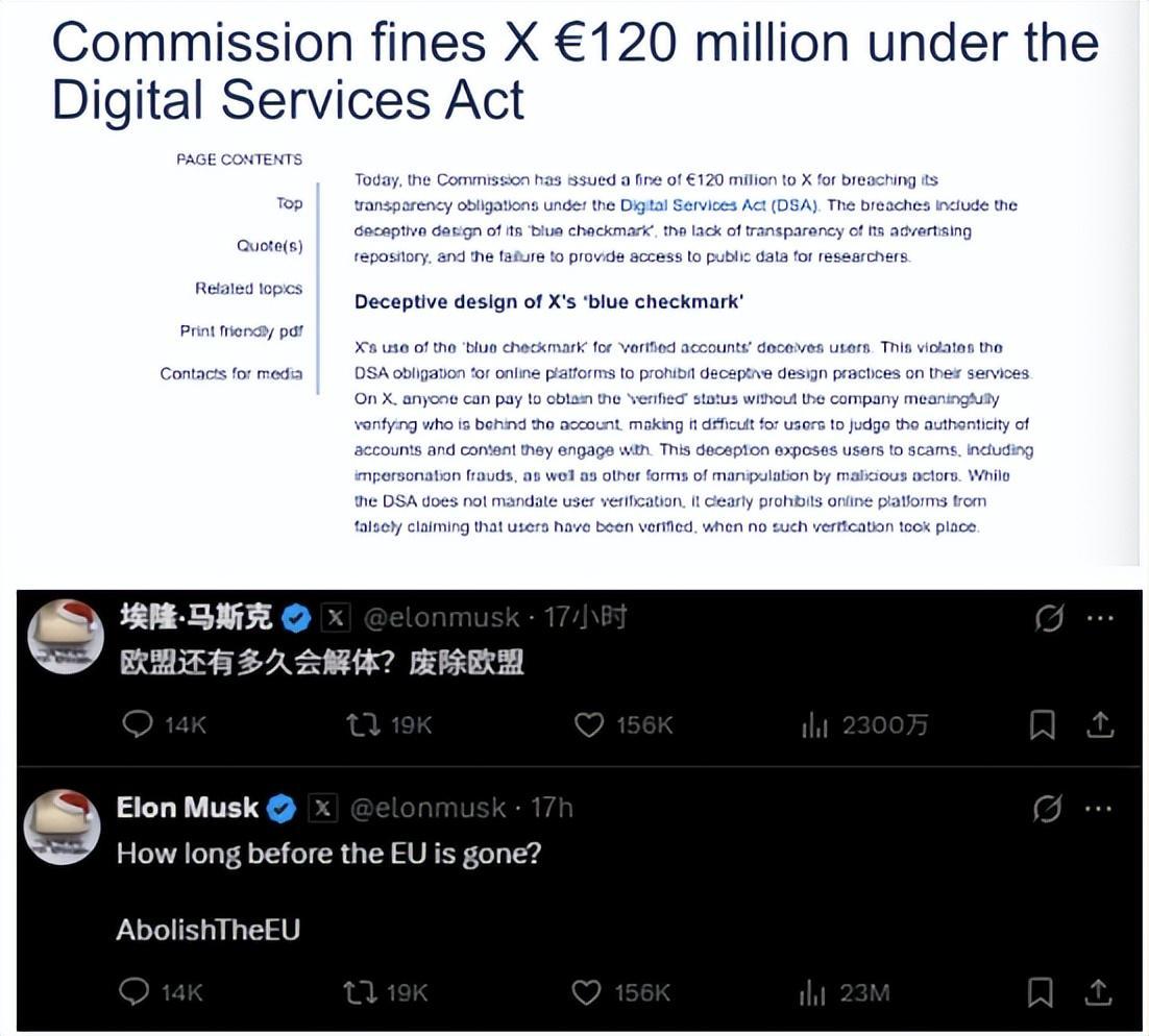 值得一提的是,社交平台X已经全面接入了Grok功能,而此前X平台就曾多次因暴露等违法内容被欧盟罚款1.2亿欧元(折合人民币近10亿元),但马斯克的回应是“欧盟应该被废除”。