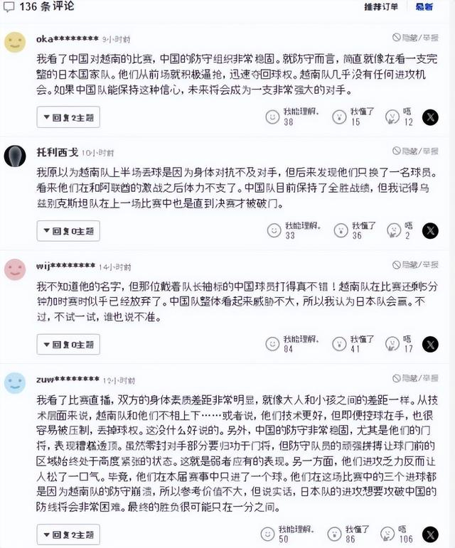 第三个,他们还对中国几位明星球员印象深刻。日本媒体专门发文报道了向余望,认为他对越南的精彩远射体现了他高超的射术,日本必须小心。还有很多球迷评论说,我不知道他的名字,但那位戴着队长袖标的中国球员踢得真不错。